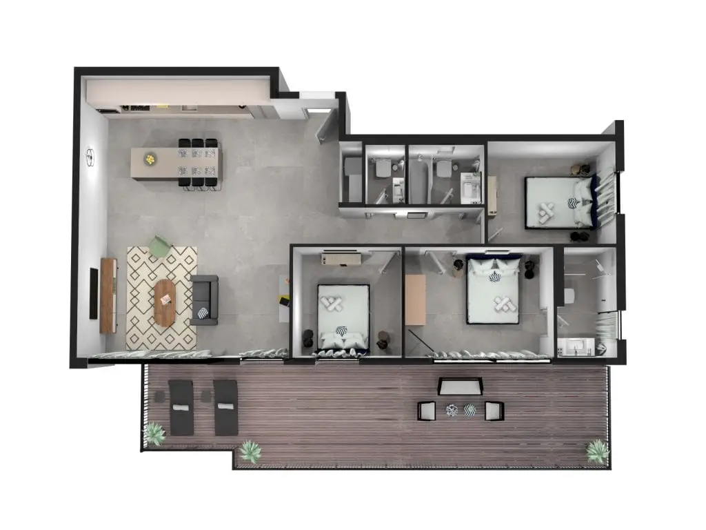 המטבח מאובזר בכל כלי הבישול שתצטרכו להכנת ארוחות בוקר, צהריים וערב. כמו כן, ישנו מקרר בו תוכלו לאחסן את כל המצרכים הטריים שתאספו בשוק, טוסטר, קומקום לתה, ועוד. בין אם הזמנתם את דירת שלושה חדרי השינה עם טרסה גדולה לחופשה קצרה ובין אם לחופשה ממושכת, תוכלו ליהנות בה מכל הנוחות לה אתם רגילים בבית, לצד שלל הטבות ופינוקים בסטנדרטים של בית-מלון.