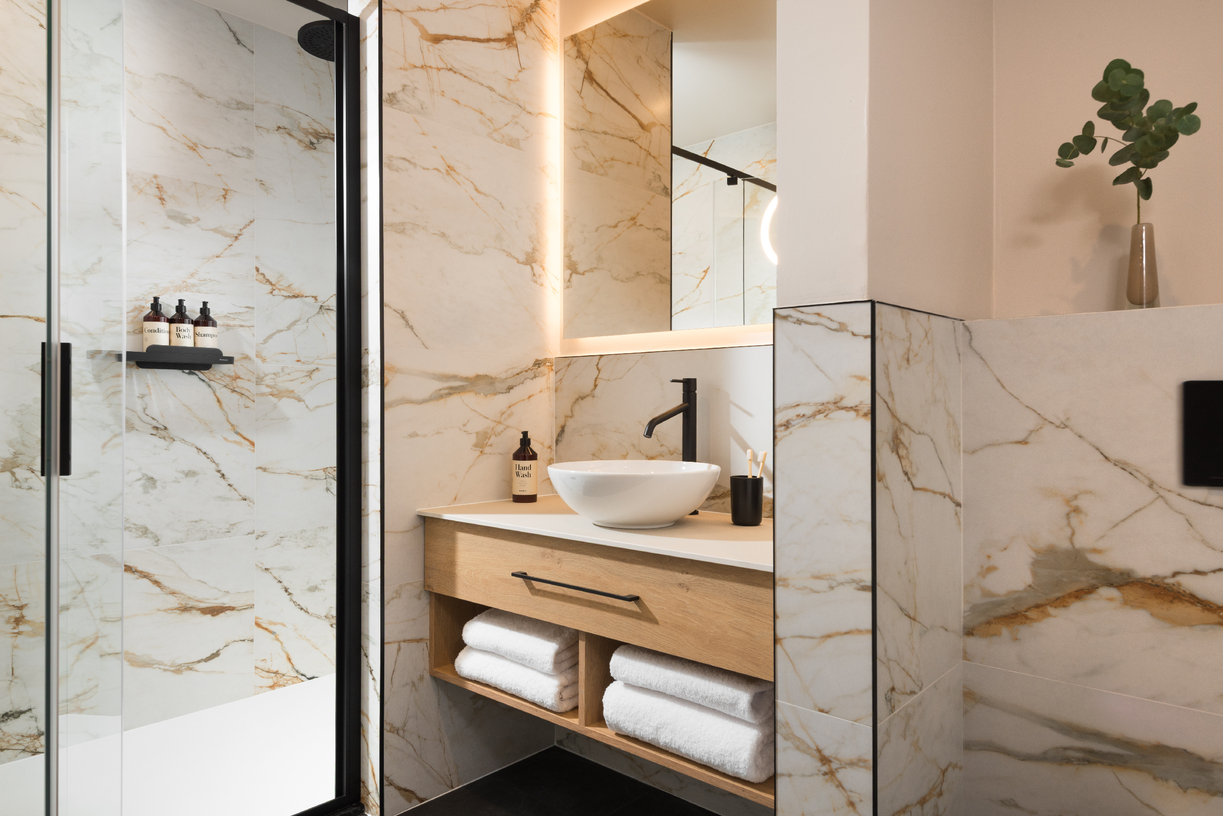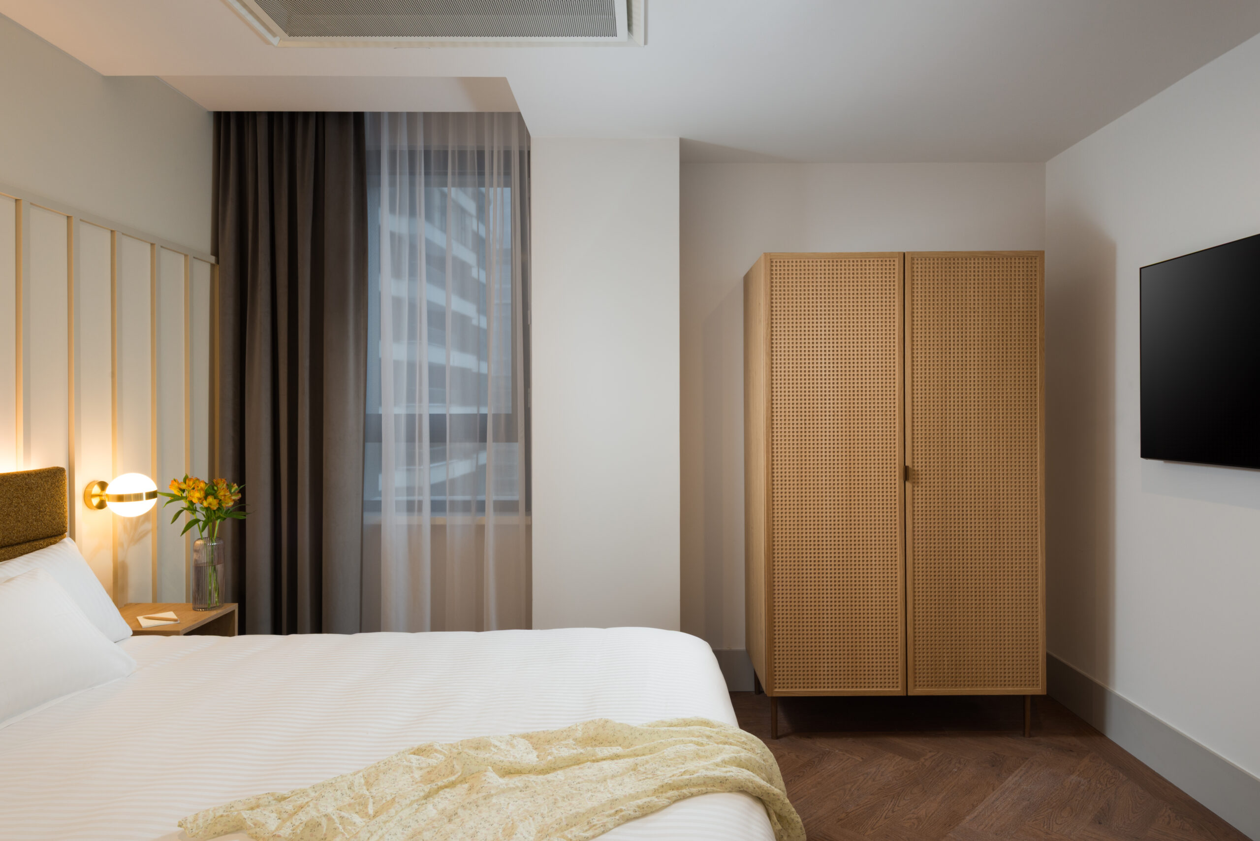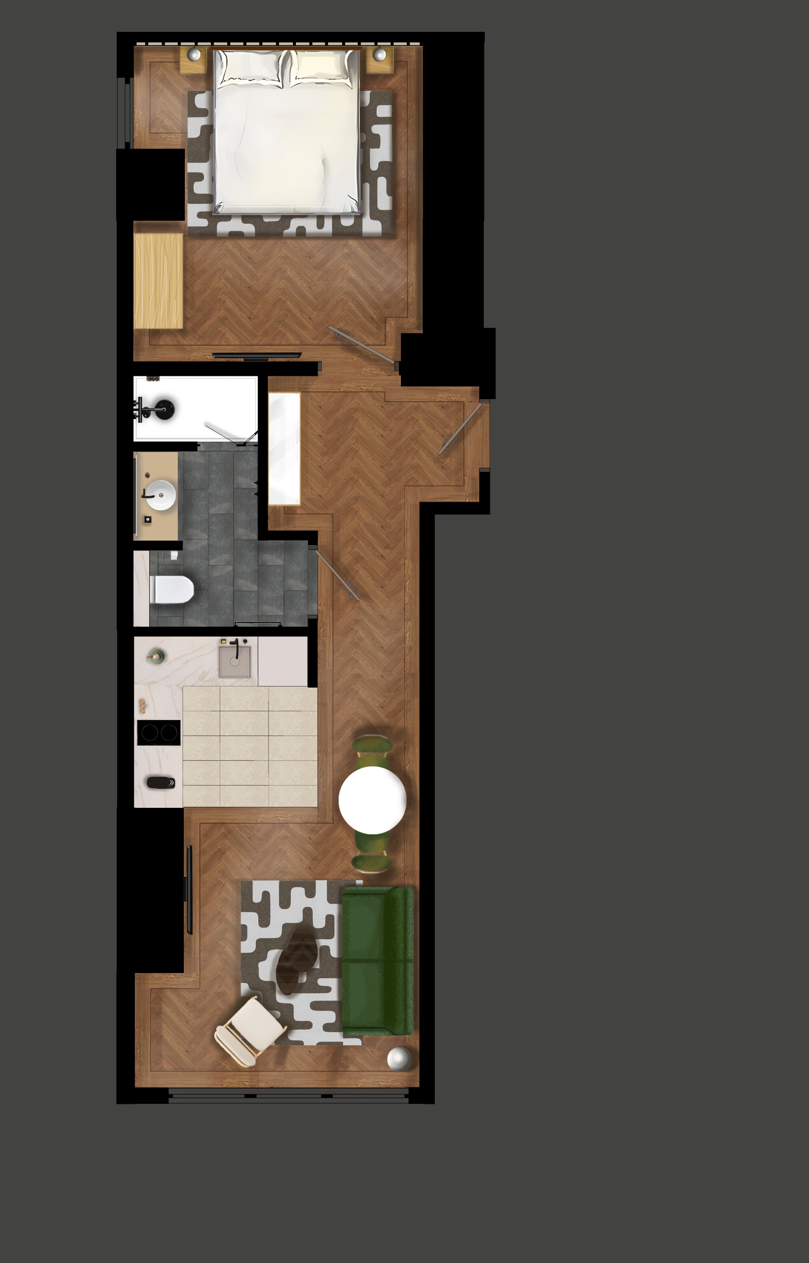 תכנון הדירה כולל חדר שינה נפרד עם מיטת קינג סייז, ספה נפתחת נוחה ופינת אוכל המתאימה לארוחות יומיומיות או לעבודה מרחוק. עיצוב הפנים משלב מינימליזם מודרני, חמימות סקנדינבית ואלגנטיות פונקציונלית, ויוצר אווירה חמה ומזמינה.